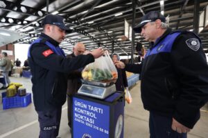 Pazarın stratejik noktalarına yerleştirilen hassas terazilerle, vatandaşların tezgahtan aldığı meyve ve sebzelerin gerçek ağırlıkları titizlikle kontrol edildi.
